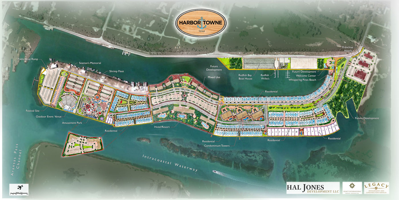 Aransas Pass was long known for its lively shrimping industry but that has since died out along with the supporting businesses. Harbor Towne will inject the area with life again in the form of high-end waterfront homes, an amusement park, public pavilions, an amphitheater and many more planned amenities. Companies such as JW Marriott and Bass Pro have been attracted to the development and are currently in talks with the developers.